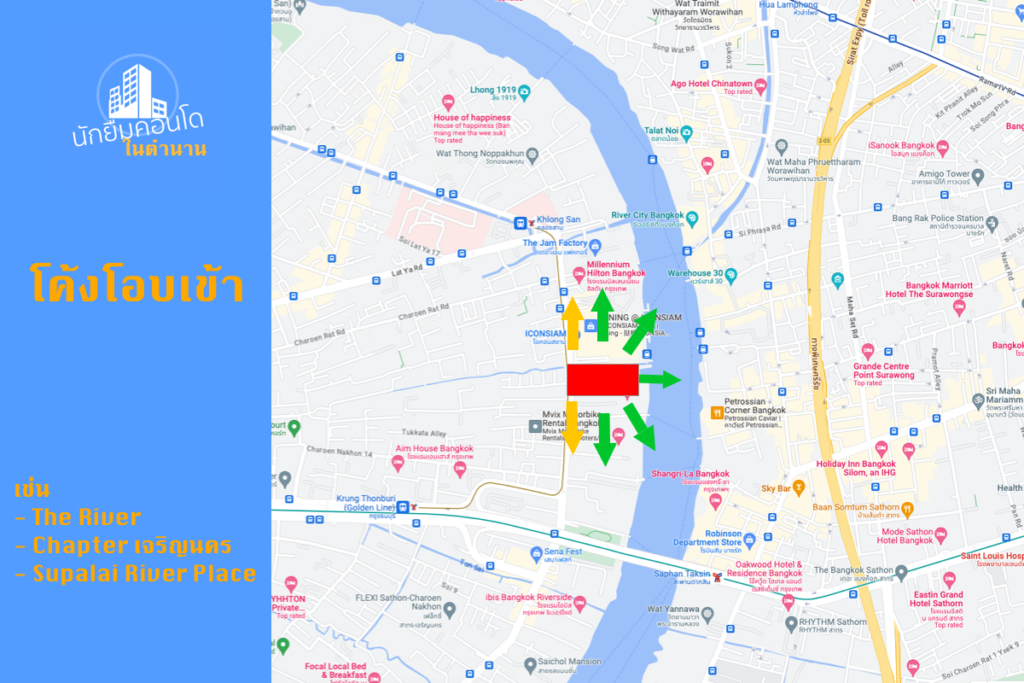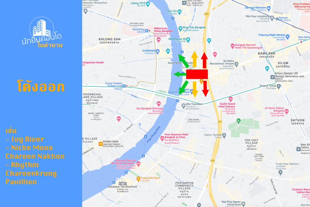 - เน้นดูการออกแบบของตึก พยายามเน้นเลือกห้องที่หันหน้าเข้าแม่น้ำตรง ๆ ไม่ใช่ห้องที่หันหน้าหนีแม่น้ำ