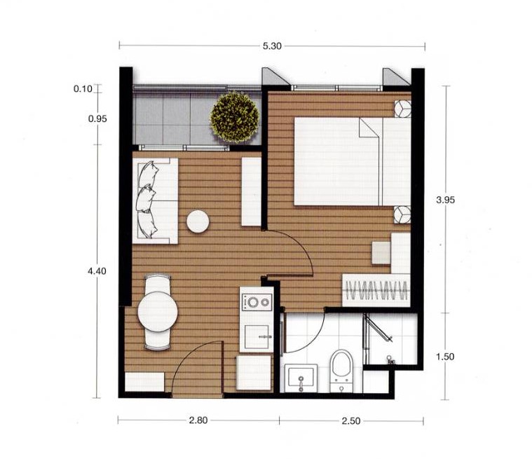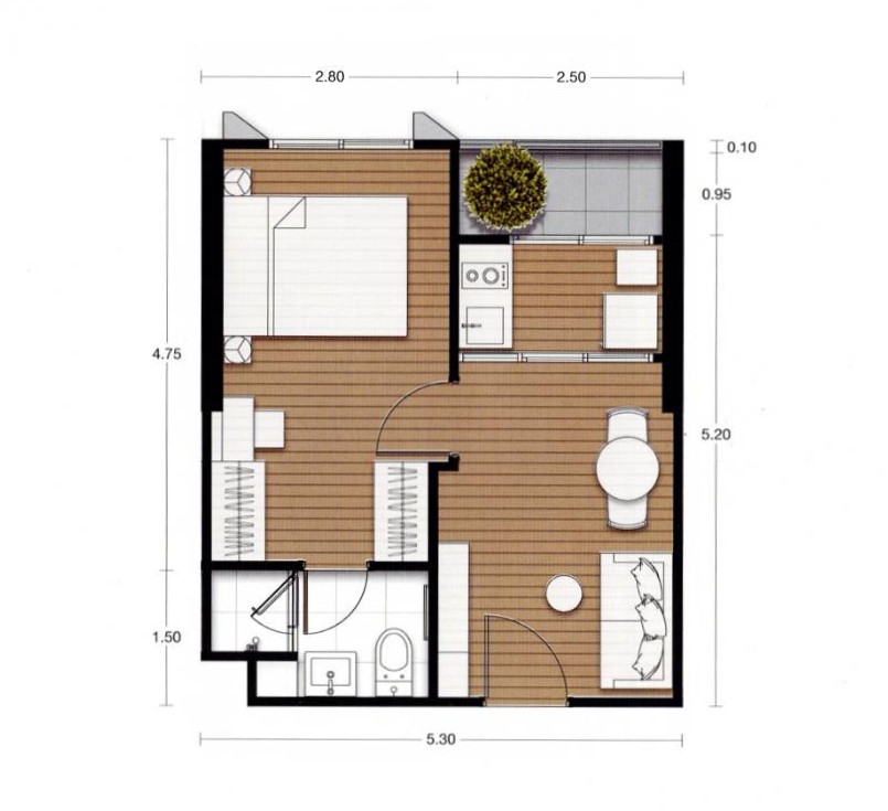 ข้อสังเกตคือ 26 ตร.ม. ทางโครงการทำห้องตัวอย่าง โดยไม่มีผนังทึบกั้นระหว่างห้องนั่งเล่น และห้องนอน แต่จากการสอบถามพนักงานขาย ห้องจริง จะเป็นผนังทึบตามปกติครับ