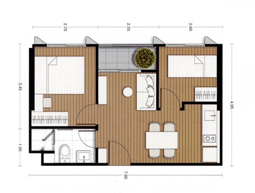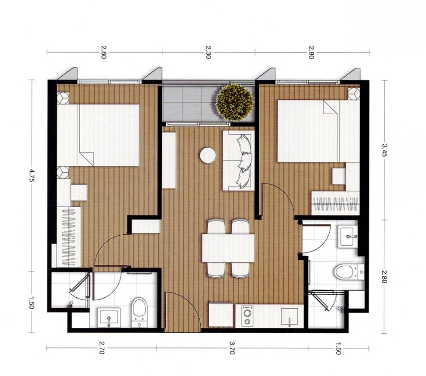 ในส่วนของไซส์ขนาด 2 Bedroom ขนาด 45.5 ตร.ม. นั้นผู้เขียนไม่ชอบเป็นการส่วนตัวเลย เพราะมีการบีบสเกลของพื้นที่ Living ที่น่าเกลียดเกินไป (ความกว้าง Living ที่ส่วนตัวผู้เขียนยอมรับได้คือ กว้าง 2.5เมตรขึ้นไป) ดังนั้นห้องนี้ไม่เหมาะสมในการอยู่อาศัยแบบครอบครัวในระยะยาวเลยครับ