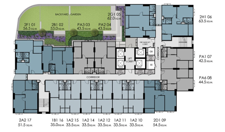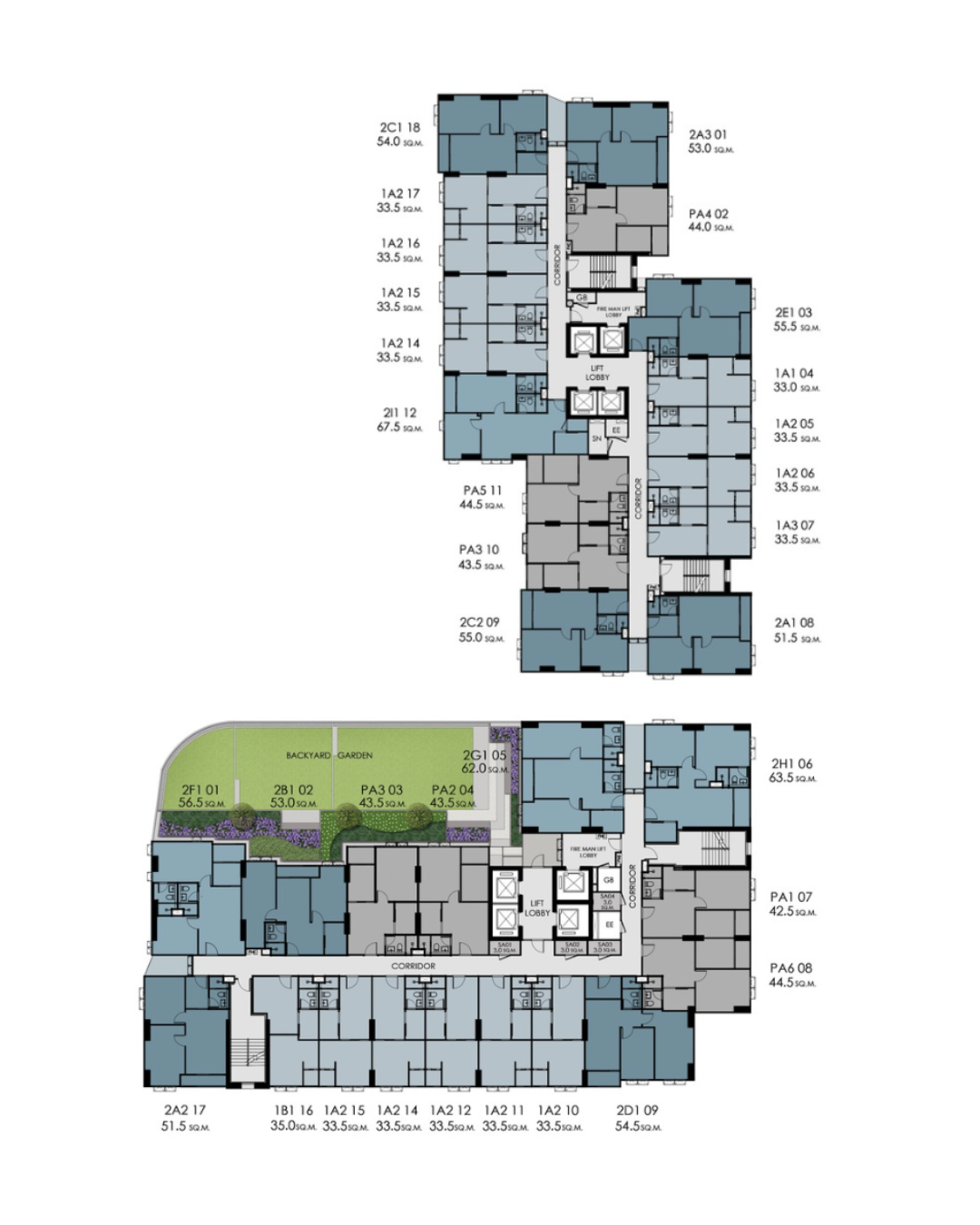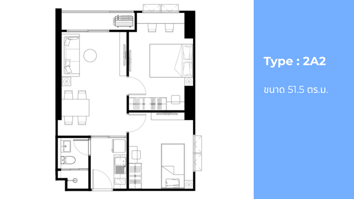 2A1 และ 2A2 ขนาด 51.5 ตร.ม. จริง ๆ นับว่าเป็น Unit Plan เดียวกันครับ แต่จะต่างกันที่การวางเสาโครงสร้างเล็กน้อย ไม่ได้มีนัยสำคัญ