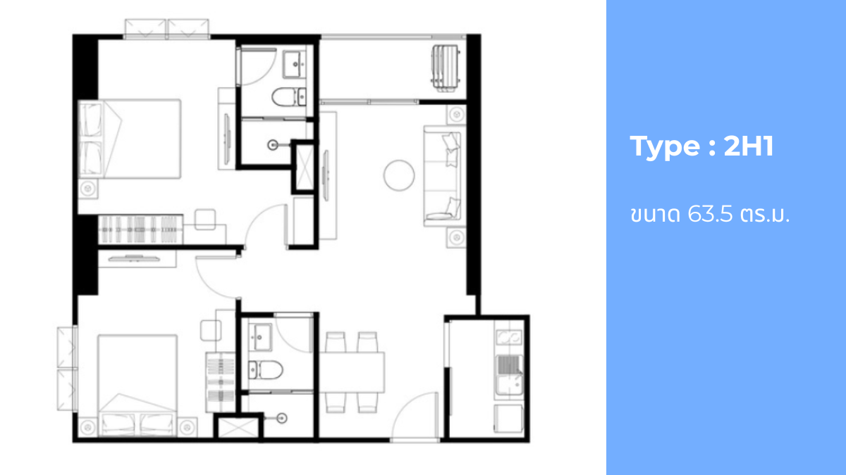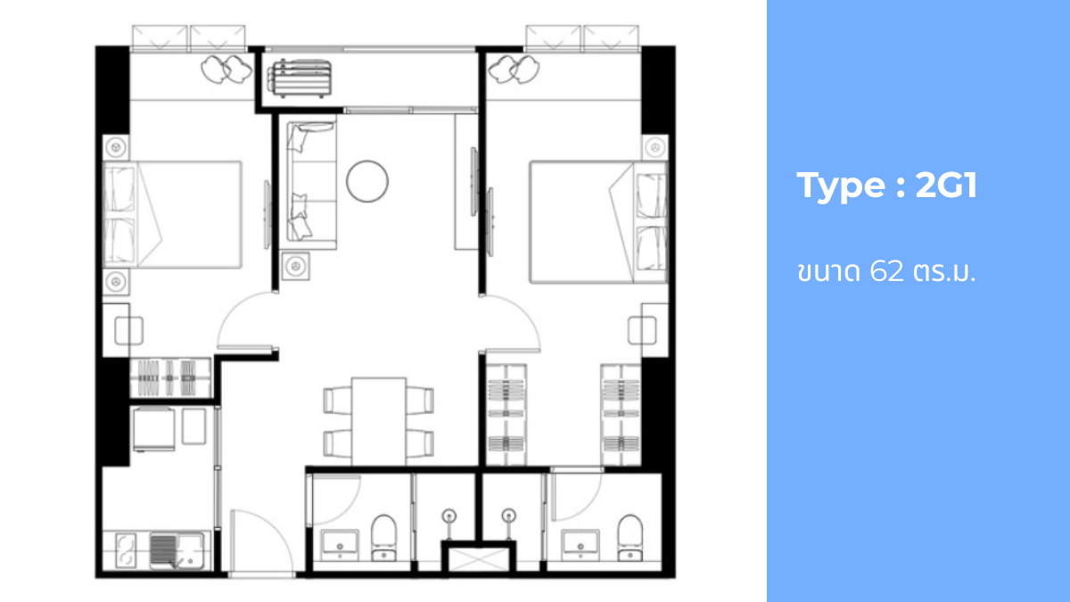 2G1 ขนาด 62 ตร.ม.และ 2H1 ขนาด 63.5 ตร.ม. เป็น 2-Bedroom ที่มี 2 Bathroom ตัวจบจริงในกรณีที่มีความต้องการซื้อ 2 Bed 2 Bath อยู่จริงได้ในระยะยาว โดยที่ 2 ห้องนี้ยังรักษาความกว้าง Living อยู่ในเกณฑ์ที่อยู่สบาย ไม่แคบเกินไป และขนาดของห้องนอนทั้งสองห้องวางได้อย่างลงตัว