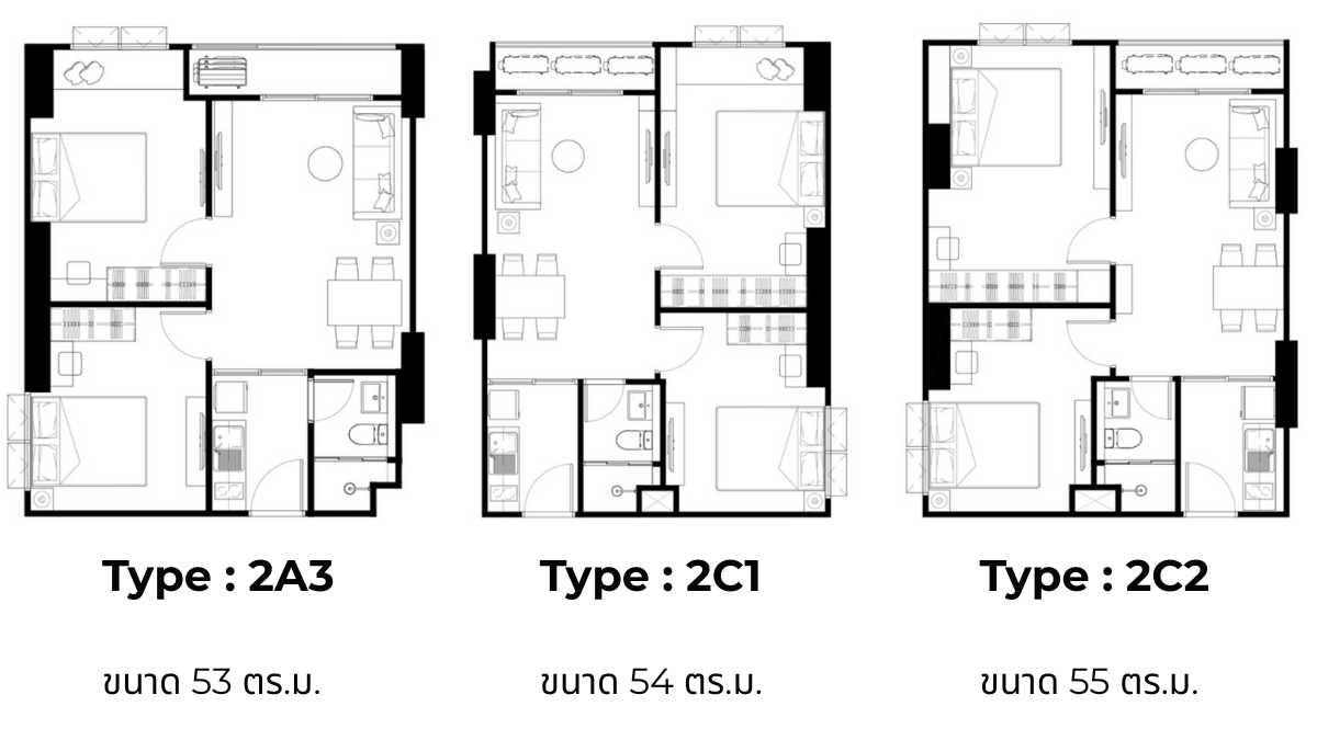 Tips นอกจากนี้ยังมี Unit Plan 2A3 2C1 2C2 ที่มี Lay Out คล้าย ๆ กัน แต่พื้นที่ใหญ่ขึ้นเป็น 53-55 ตร.ม. แตกต่างเล็กน้อยที่ ความกว้าง Living / พื้นที่ห้องนอน / การวางตำแหน่งครัวและห้องน้ำ และตำแหน่งเสาต่าง ๆ ครับ เลือกที่ความชอบ ตำแหน่ง งบประมาณ และการใช้งานได้เลยครับ